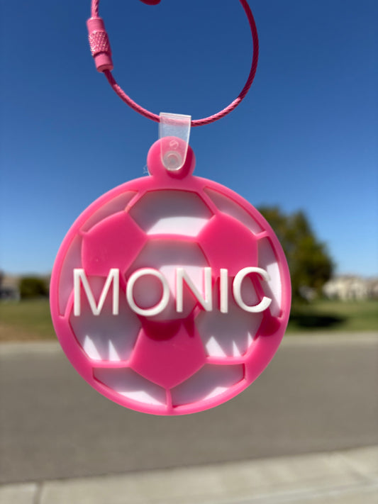 Custom Acrylic Laser-Cut Soccer Name Tags (White background & pink letters)
